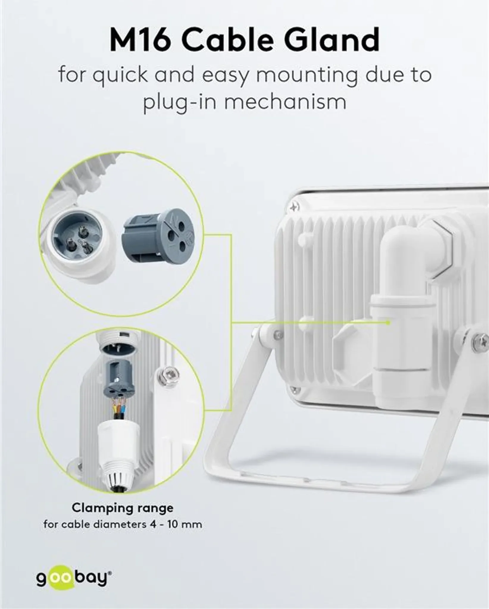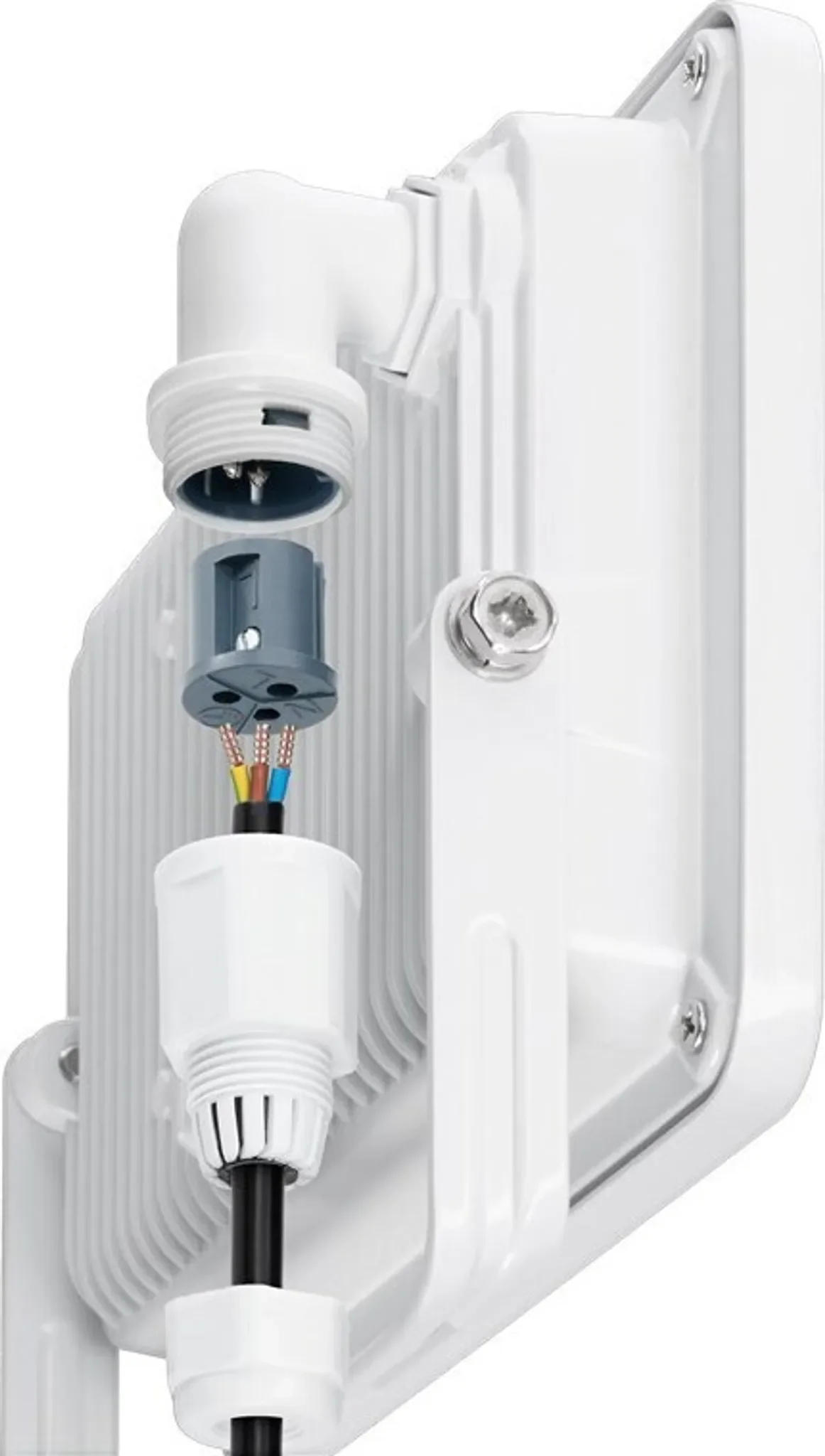 Energieeffizienter LED-Fluter für den Außenbereich, ideal für Fassadenbeleuchtung, Hauseingänge und Garten. Mit Schutzart IP65, langlebiger Bauweise, großer Lichtausbeute und einfacher Montage über M16-Kabelverschraubung.