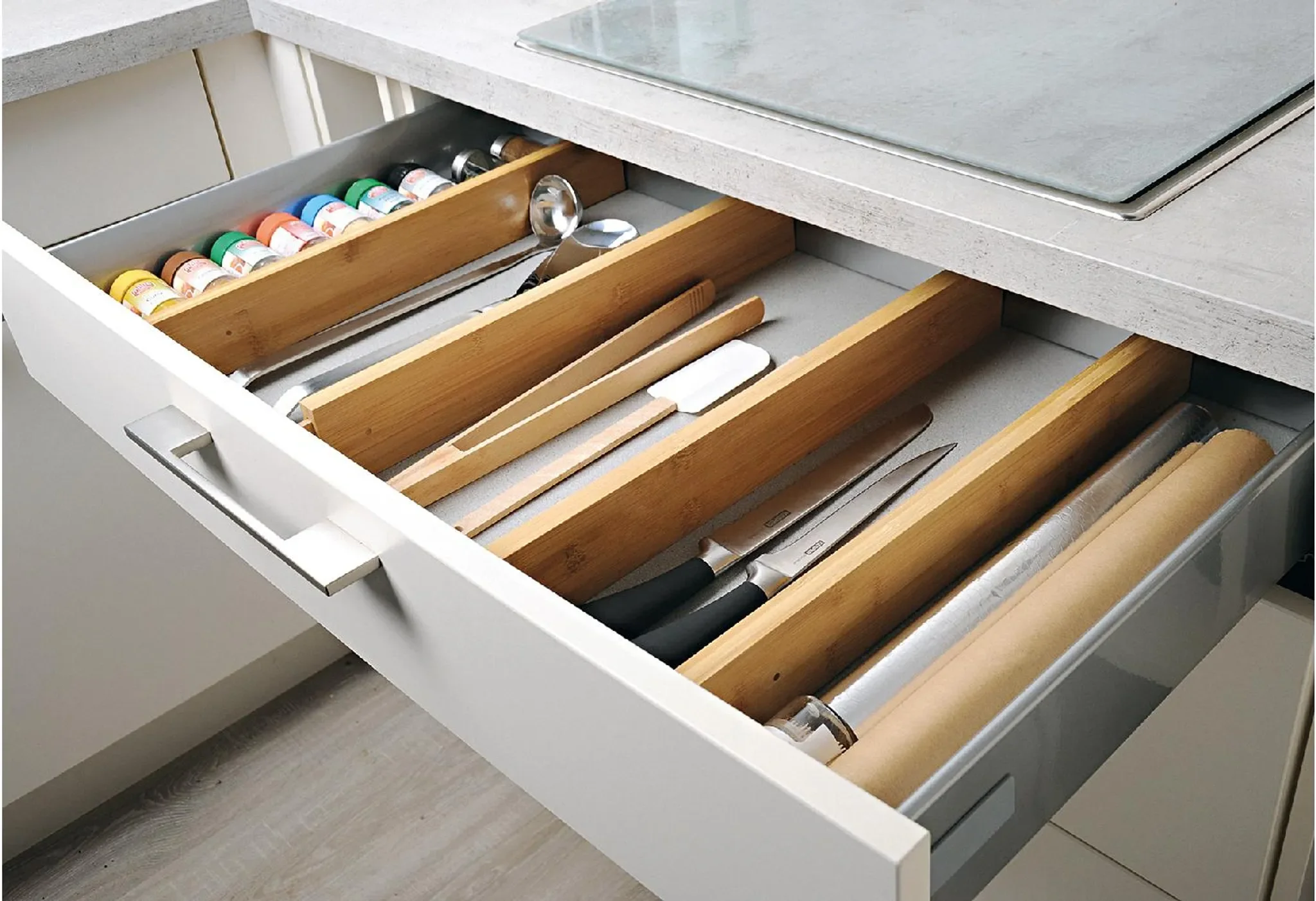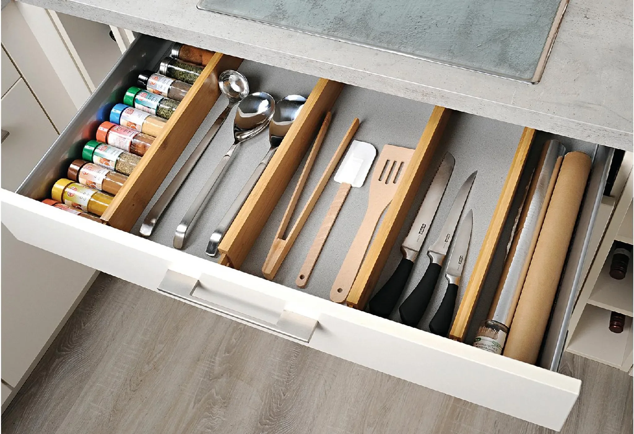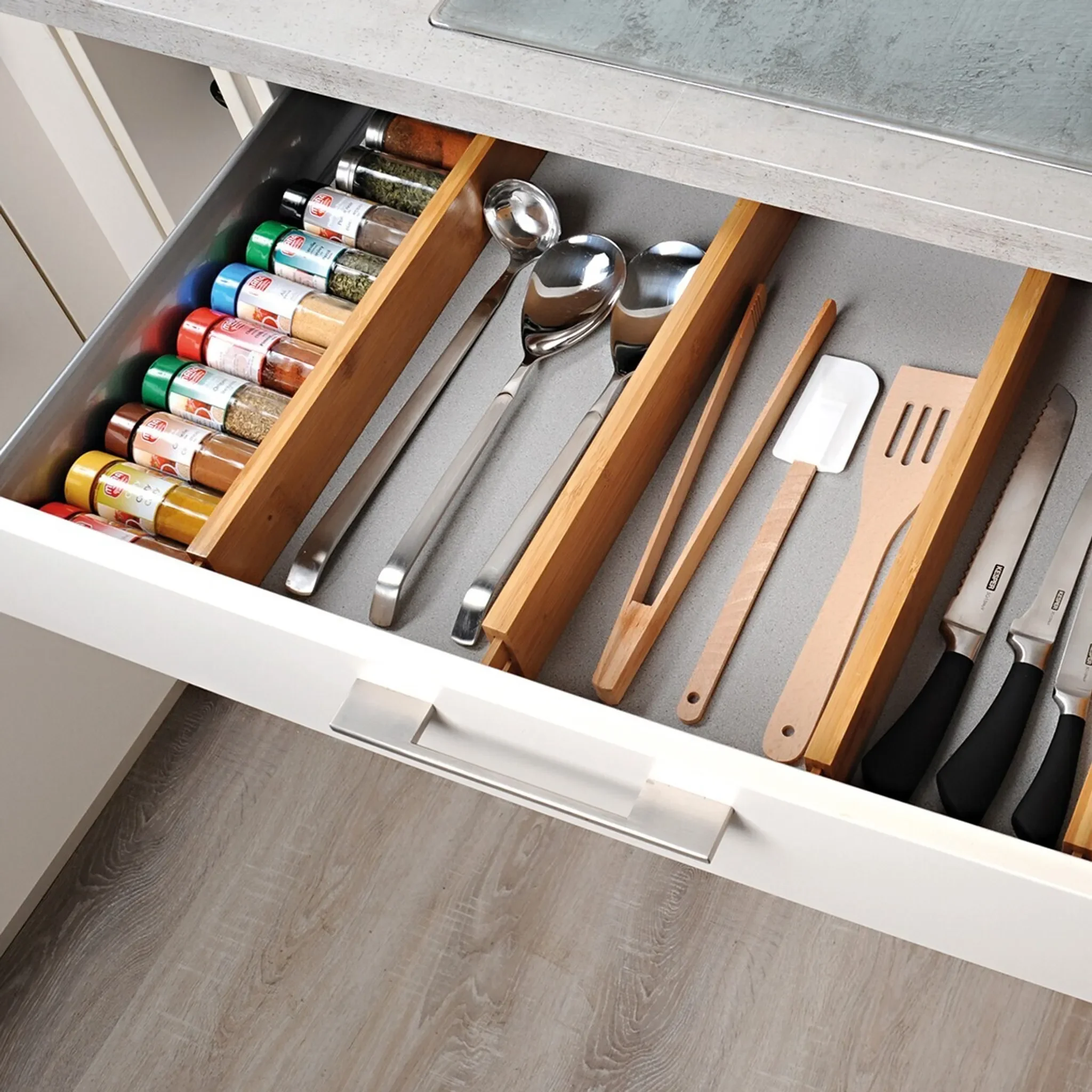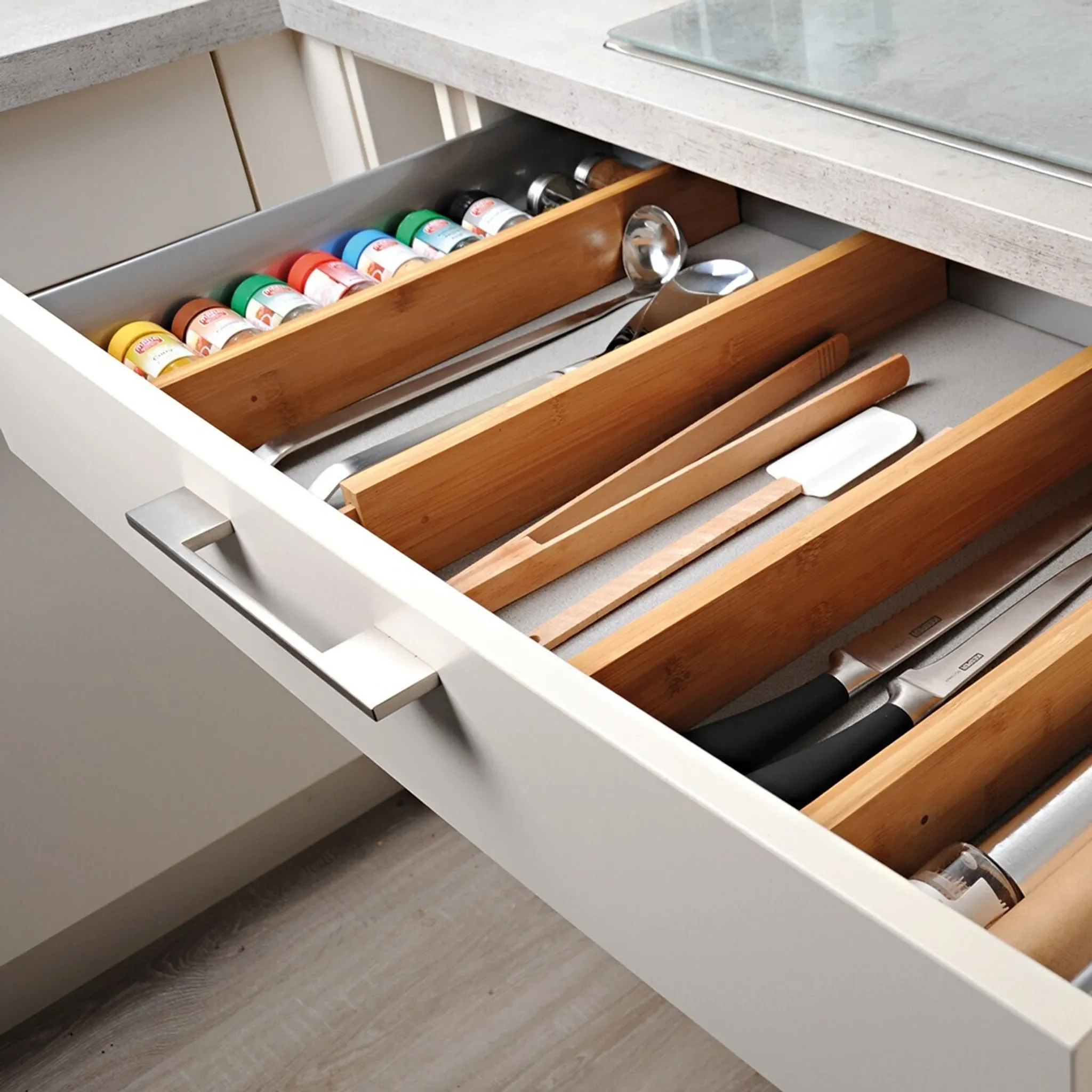 Die Bambus-Trennwände sind langlebig, feuchtigkeitsresistent und bringen einen natürlichen, eleganten Look in Ihre Schubladen. Sie lassen sich einfach einbauen, individuell anpassen und sorgen für eine übersichtliche Raumaufteilung. Perfekt, um Ordnung zu schaffen und Ihre Gegenstände schnell griffbereit zu haben.