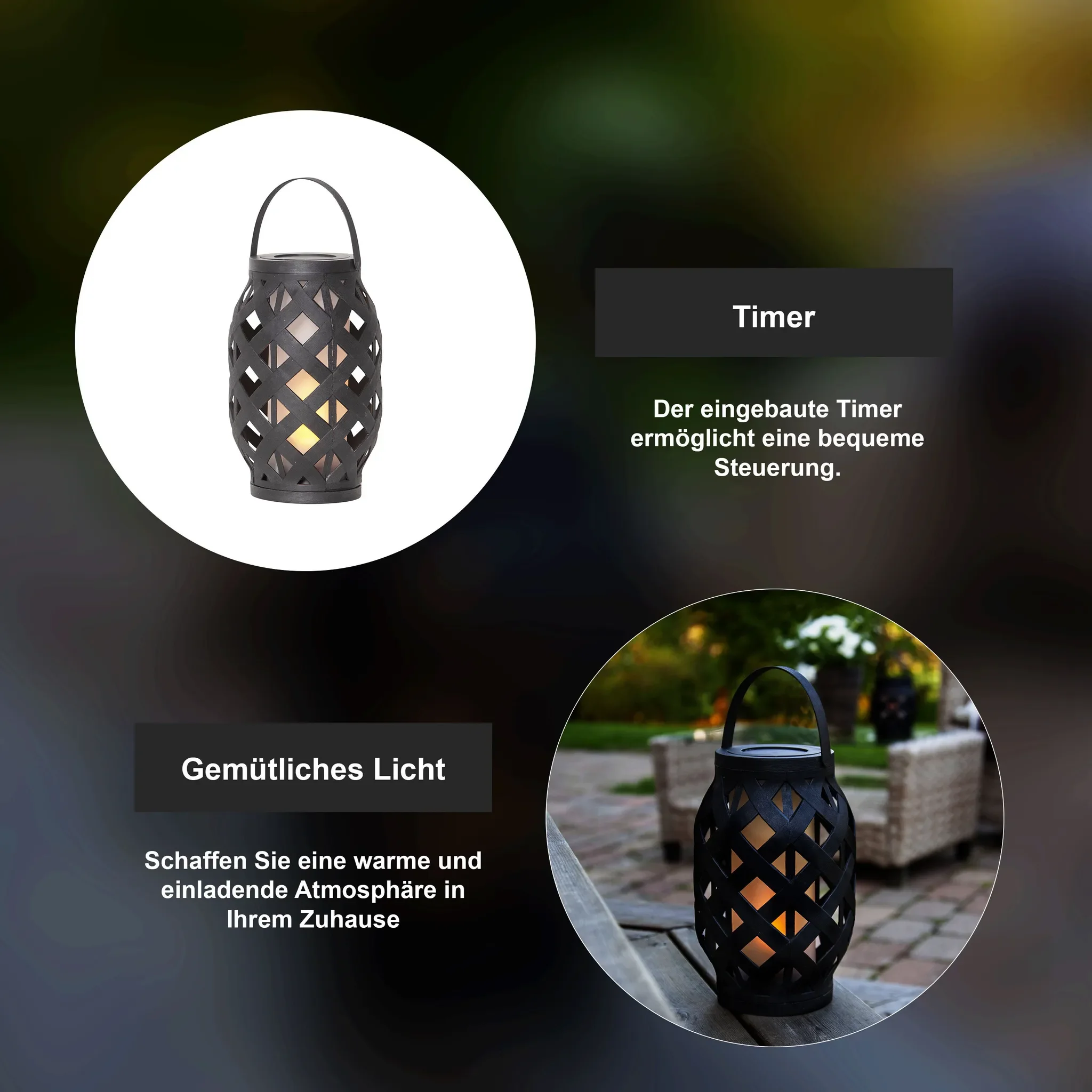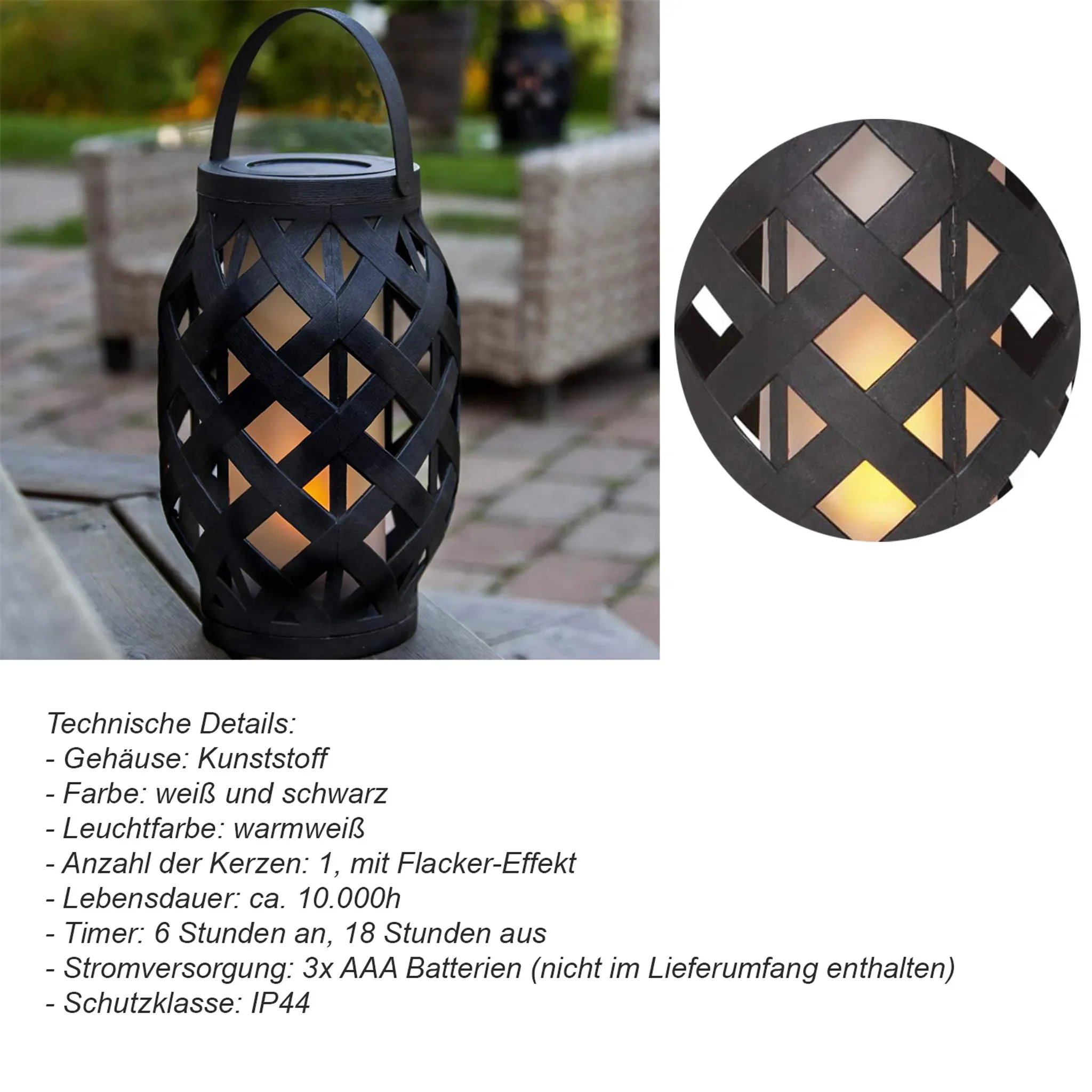 Die LED-Laterne sorgt mit ihrem tanzenden Flammeneffekt für eine gemütliche, warme Atmosphäre. Ideal für Balkon, Terrasse, Garten oder Wohnräume. Das integrierte Timer-System ermöglicht eine automatische Lichtsteuerung und spart Energie. Durch das wetterfeste IP44-Gehäuse ist die Laterne perfekt für Outdoor-Einsätze geeignet.